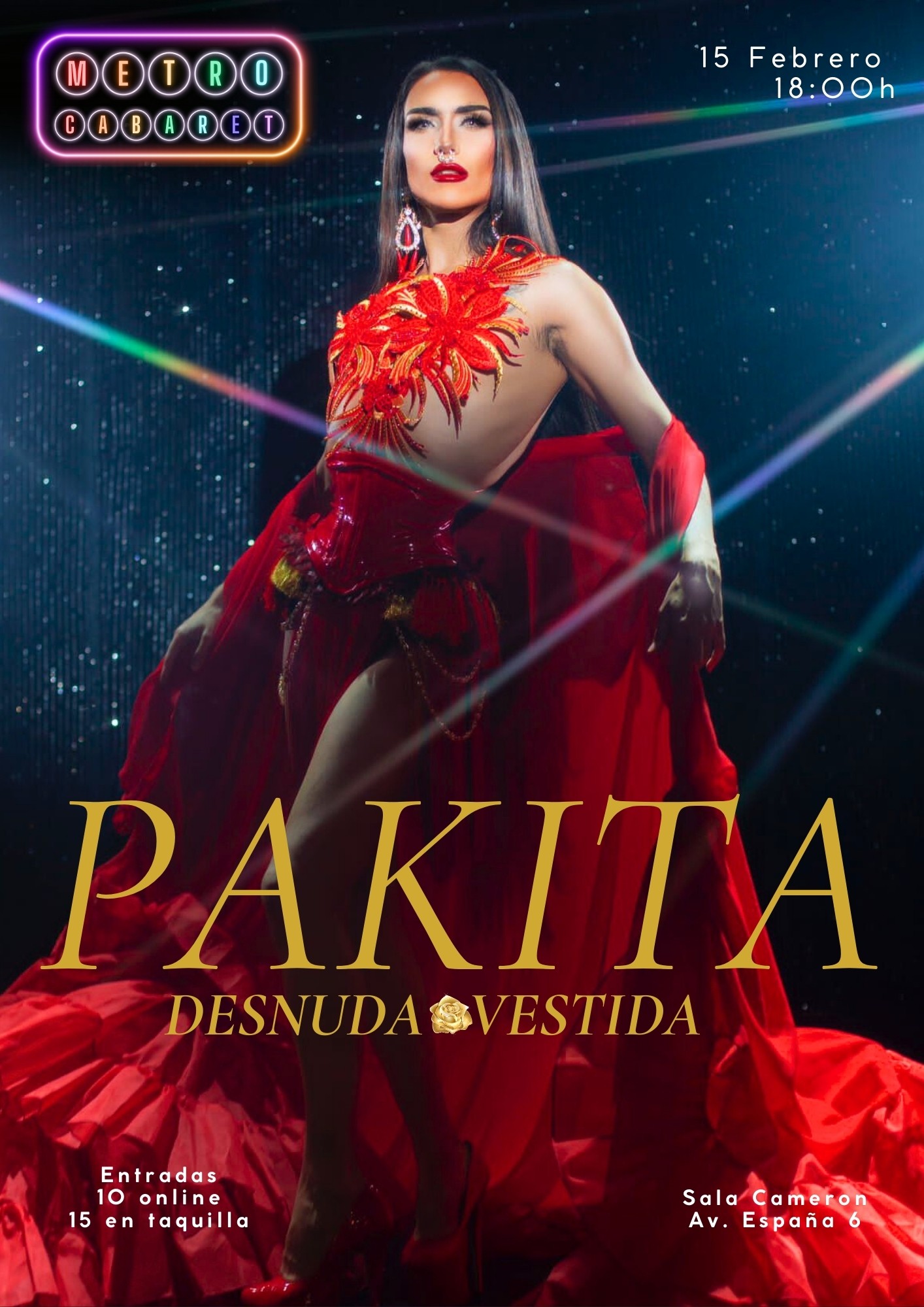 Después de conquistar escenarios y públicos, Pakita regresa a Metro, al Cabaret de la Metro, para presentar “Desnuda · Vestida”, un espectáculo personal, poderoso y absolutamente magnético. Un viaje escénico donde la autenticidad, la fuerza y la vulnerabilidad conviven sobre el escenario. Un show que nos muestra quién es Pakita, donde el cuerpo, la mirada y la emoción se convierten en lenguaje. Elegancia, presencia y verdad. Pakita se presenta sin filtros, con una propuesta intensa y cuidada que confirma por qué es una de las artistas más impactantes del panorama actual. Una cita imprescindible para quienes aman el cabaret, el drag de alto nivel y los espectáculos que dejan huella. Vive el regreso de Pakita al cabaret como nunca antes la has visto.