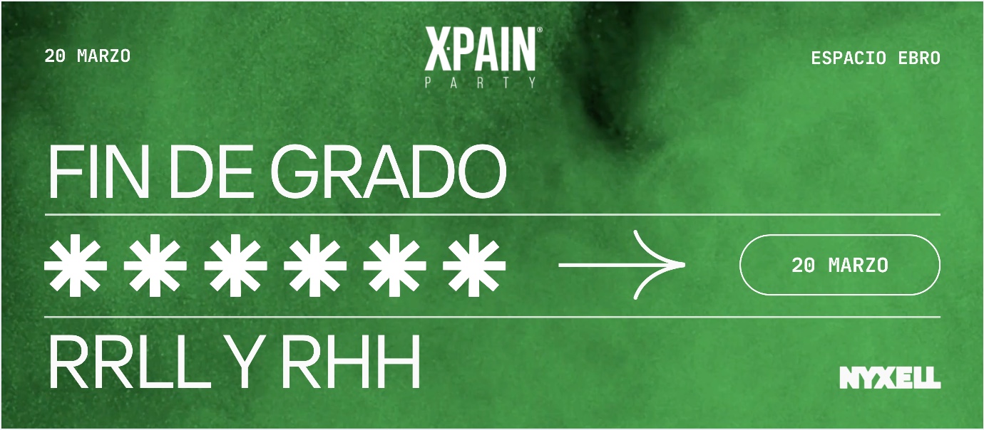 🎉 | @xpainparty · Fin de Grado RRLL y RRHH 🎓 Viernes 20 · Marzo 🕑 | Horario cena 21:30 🕑 | Horario fiesta 01:00 📍 | Espacio Ebro 🔞 | El acceso al recinto estará prohibido para menores de 18 años 🎫 | Venta de entradas exclusivamente a través de nuestra web