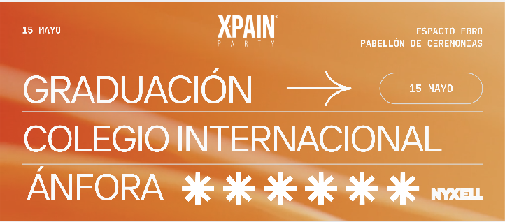 🎉 | @xpainparty · Graduación Colegio Internacional Ánfora 🎓 Viernes 15 · Mayo 🕑 | Horario cena 22:00 🕑 | Horario fiesta 01:00 📍 | Fincas de la Expo (Espacio Ebro y Pabellón de Ceremonias) 🎫 | Venta de entradas exclusivamente a través de nuestra web
